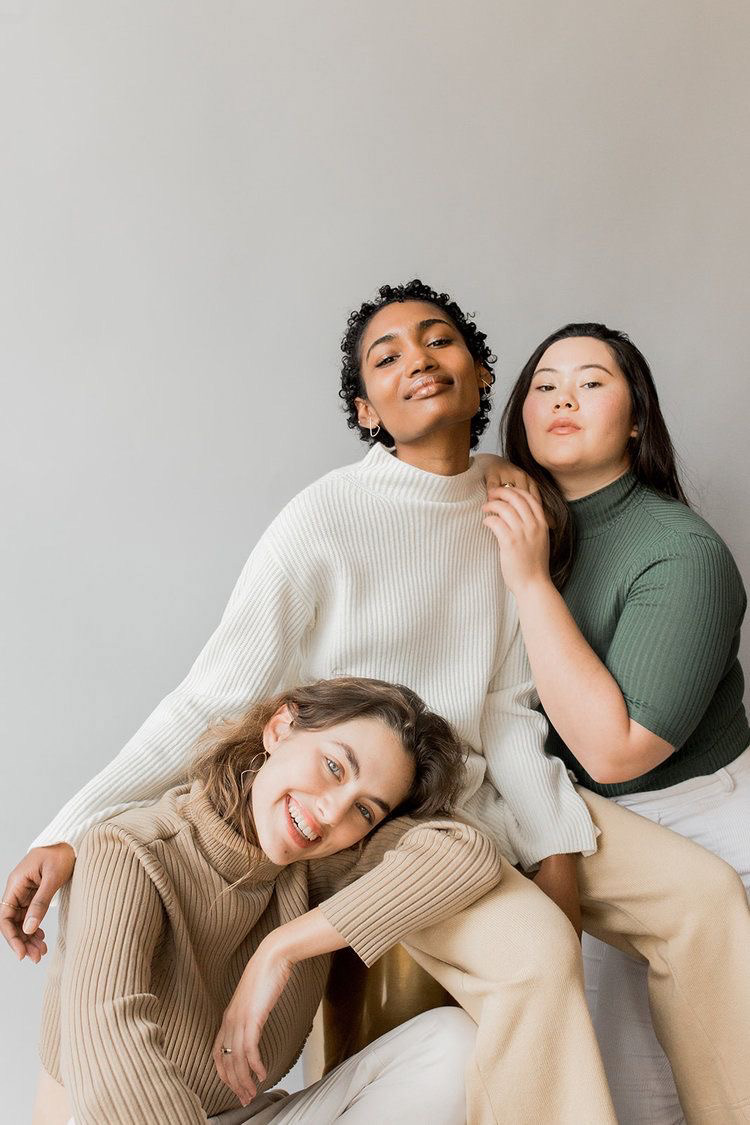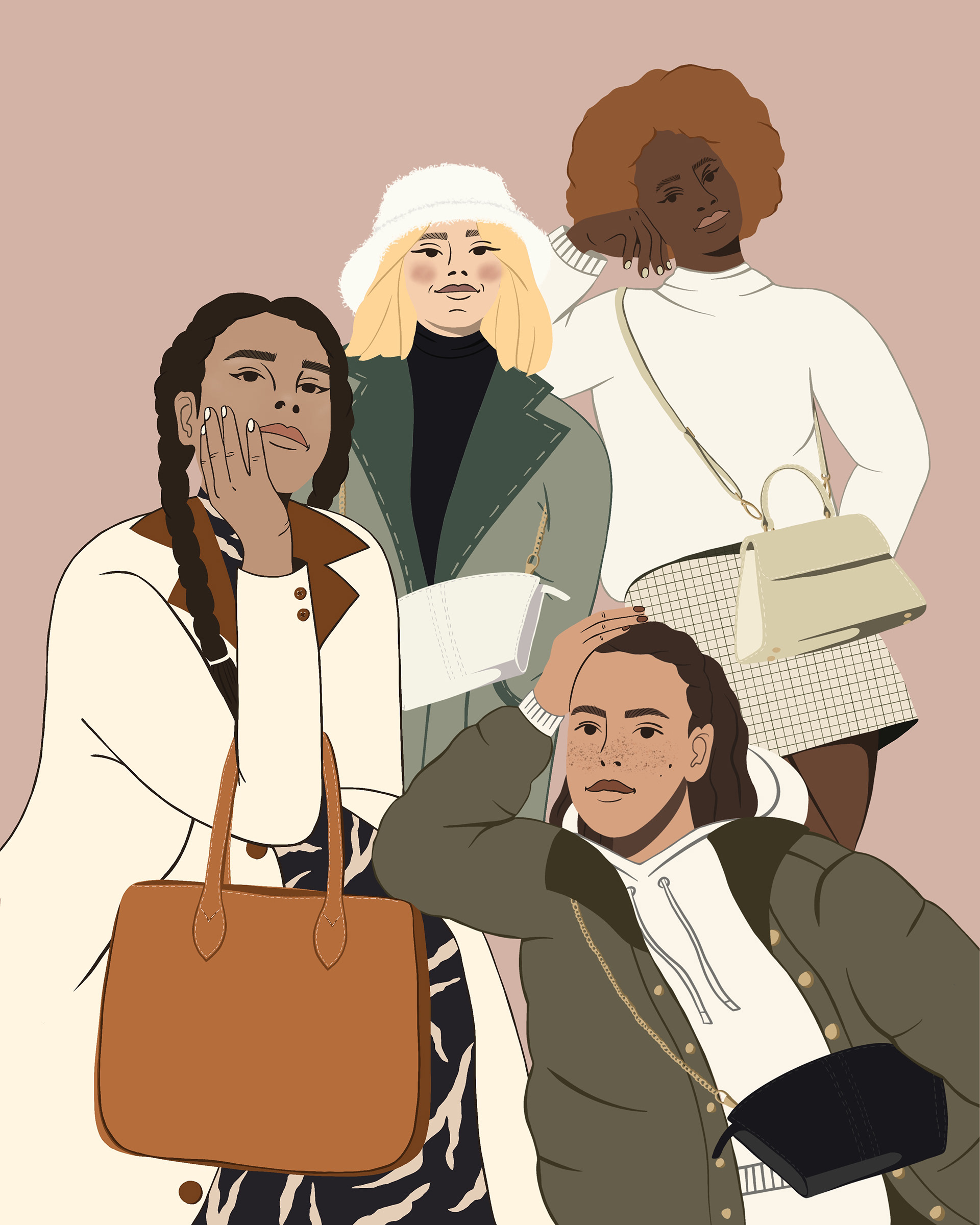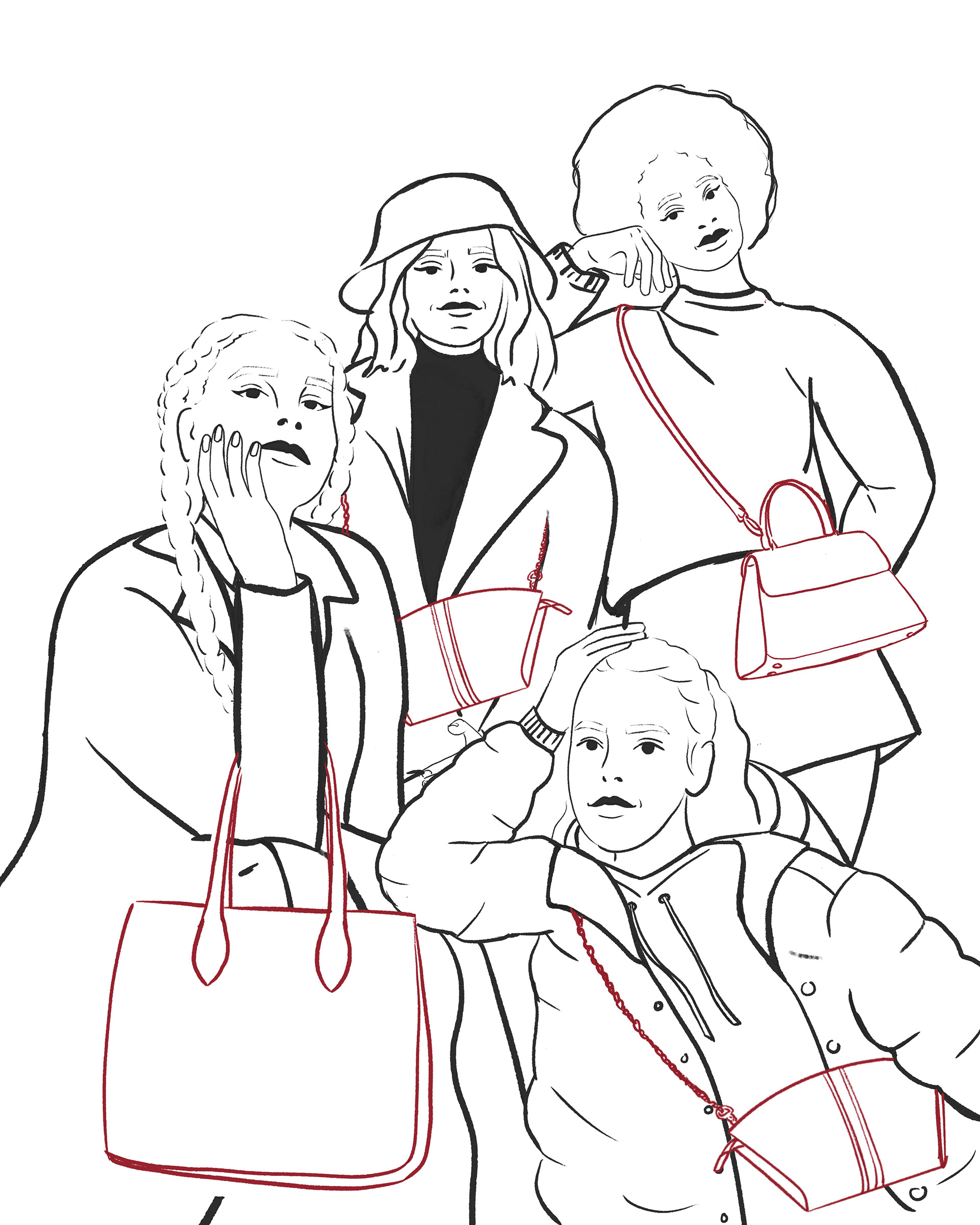 Création d'une illustration pour une marque lausannoise de sacs en cuir vegan. Brief: 4 femmes portant toutes un sac KOVU conception, croquis, illustration