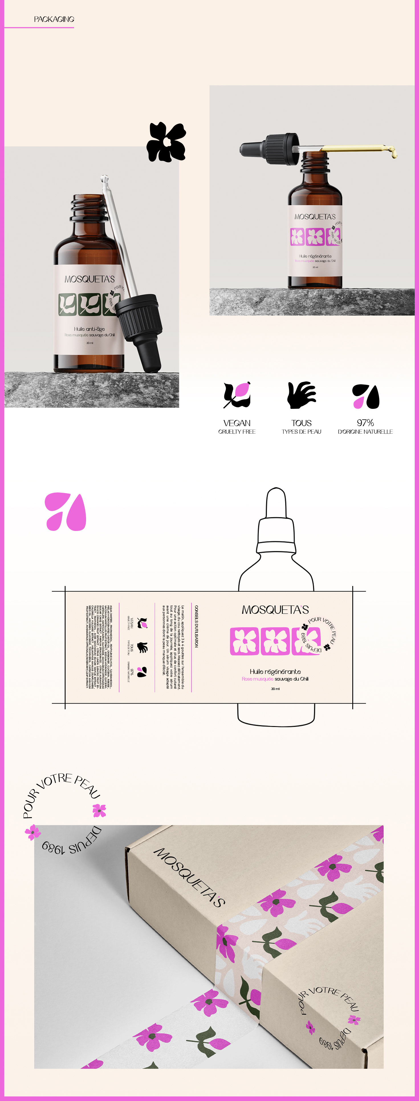 Proposition de concept/rebranding pour la marque suisse Mosqueta's proposant des cosmétiques bio en majorité issus de rose musquée du chili. idée, design graphique